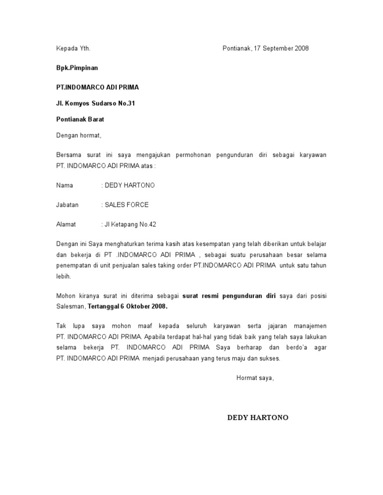 Salah satunya, anda harus menggunakan bahasa indonesia yang baik dan benar. Berikut terdapat contoh surat pengunduran diri dari perusahaan yang perlu anda ketahui dengan benar, yaitu sebagai berikut: Namun sebisa mungkin jangan sampai menyinggung perasaan pihak lain. Pangkal perjuangan menyatakan dengan sesungguhnya bahwa mulai tanggal 23 april 2019 saya mengajukan permohonan untuk mengundurkan diri sebagai karyawan pt.sumber alfaria trijaya. Jika dibuat dengan sopan dan benar, akan lebih besar peluang anda sebagai karyawan mendapat referensi bagus dari tempat kerja.